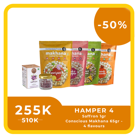 Để mang đến trải nghiệm tri ân độc đáo và đẳng cấp, Combo Quà Tặng Tri Ân Cao Cấp này đã được Angel Fine Food sáng tạo với sự kết hợp tinh tế của Saffron 1gr và các sản phẩm Conscious, bao gồm Makhana Mirch Masala 65gr, Conscious Makhana Pepper 65gr, Conscious Makhana Peri Peri 65gr, và Conscious Makhana Herb and Cheese 65gr.
